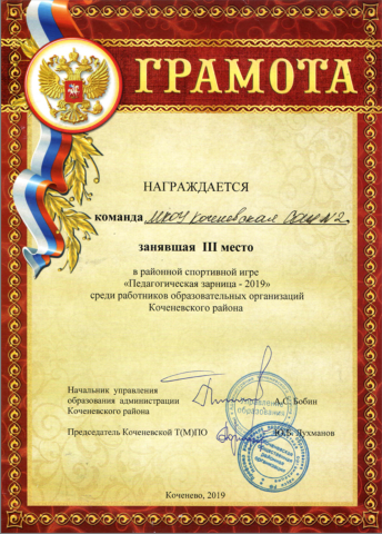 - грамотами за 3 место педагоги групп дошкольного образования в составе команды МКОУ Коченевская СОШ №2: М.В.Грицан,О.И.Губанова, Л.В.Иванова, О.Н.Тарабанова, Н.П. Ковалева, И. Ф. Перепелкина (октябрь 2019 год)