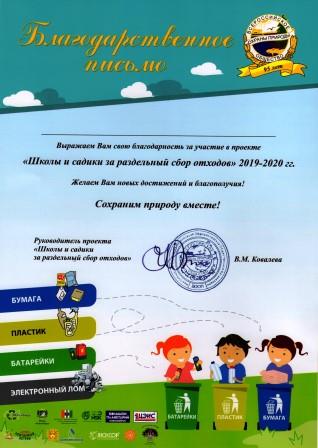 Областной проект «Школы и сады за раздельный сбор отходов», награждены благодарственными письмами за участие педагоги, дети и родители групп дошкольного образования МКОУ Коченевская СОШ №2 (декабрь 2019 год)