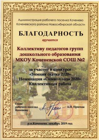 Муниципальный конкурс «Зимняя сказка – 2020», в номинации «Символ года - 2020", награждены Благодарностью главы р. п. Коченево А.П. Пригода за участие в конкурсе: коллектив групп дошкольного образования МКОУ Кочневская СОШ №2 (декабрь 2019 год)