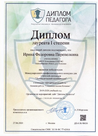 - Дипломом лауреата I степени учитель –логопед Ирина Фёдоровна Перепелкина (июнь 2020 года)