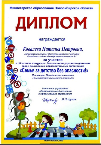 - дипломом победителя старший воспитатель Наталья Петровна Ковалева в номинации «Воспитываем грамотного пешехода» (июнь 2020 года)