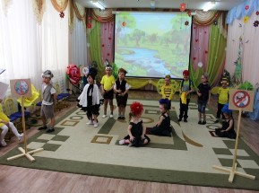 В музыкальном зале проведены театрализованные постановки. В гости к детям пришли сказочные герои — друзья и охранники леса: Елочка, Шалун, Умница и Тихоня, роли которых исполнили воспитанники подготовительной группы. Эколята проверили знания детей по экологии, посмотрели театрализованные постановки, весело и задорно поиграли в игры «Отсортируй мусор», «Лесные спасатели», «Умеет ли природа говорить».
