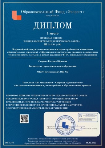 - Дипломом за 1 место награждена воспитатель Евгения Юрьевна Скорина (декабрь 2022 г.)