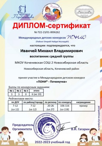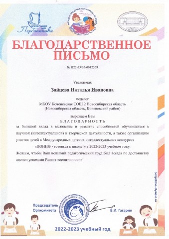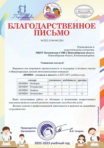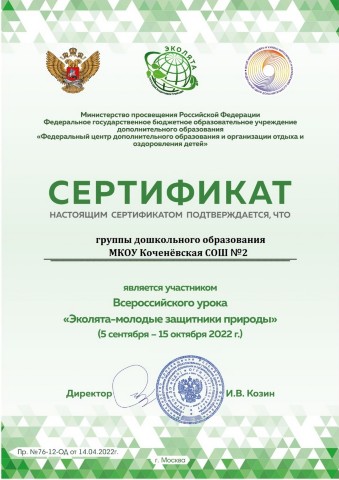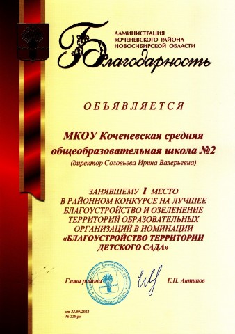- Благодарностью администрации Коченевского района за 1 место коллектив групп дошкольного образования МКОУ Коченевская СОШ №2 (сентябрь 2022 год):