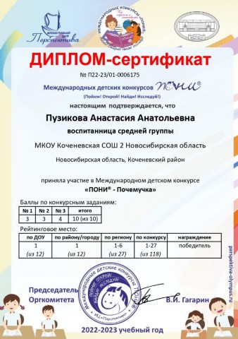 Международный интеллектуальный детский конкурс «ПОНИ®-Почемучки», награждены 12 воспитанников:
