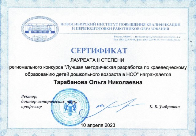 - сертификатом «Лауреата 2 степени» воспитатель Ольга Николаевна Тарабанова (апрель 2023 год);