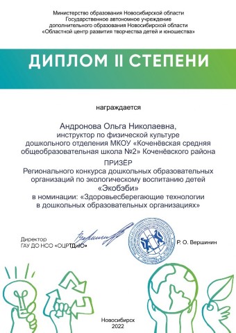 - в номинации «Здоровьесберегающие технологии в дошкольных образовательных организациях» награждён Дипломом II степени инструктор по физической культуре Ольга Николаевна Андронова (декабрь 2022 год)