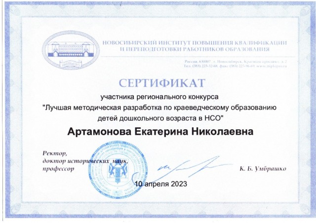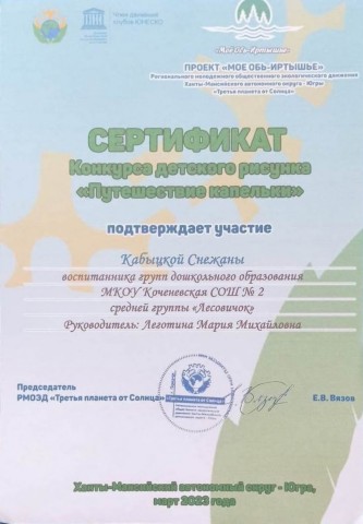 - сертификатом участников воспитатель Екатерина Николаевна Артамонова, музыкальный руководитель Наталья Евгеньевна Русскина (апрель 2023 год)