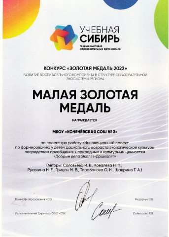 - малой золотой медалью старший воспитатель Наталья Петровна Ковалева, музыкальный руководитель Наталья Евгеньевна Русскина, воспитатели Марина Васильевна Грицан, Ольга Николаевна Тарабанова, Татьяна Александровна Шадрина (октябрь 2022 год);