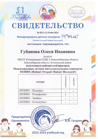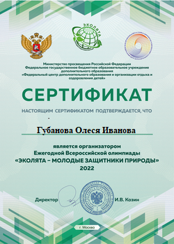- сертификатами организаторов педагоги Екатерина Николаевна Артамонова, Олеся Ивановна Губанова, Наталья Ивановна Зайцева, Наталья Петровна Ковалева, Ольга Николаевна Тарабанова (октябрь-ноябрь 2022 года);