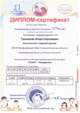 - дети старшей группы №1 "Дюймовочка": дипломом победителя - 1 ребёнок, сертификатами участников - 6 детей, педагоги Олеся Ивановна Губанова, Евгения Юрьевна Скорина (апрель 2023 года);