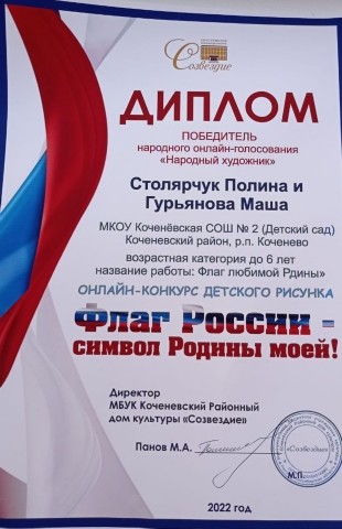 - Дипломом победителя в народном онлайн-голосовании «Народный художник» воспитанницы подготовительной группы Столярчук Полина и Гурьянова Маша под руководством воспитателя Ольги Николаевны Тарабановой (сентябрь 2022 год)