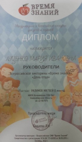 - Дипломом руководителя за подготовку детей к интернет–викторине педагог-психолог Мария Ивановна Луценко (октябрь 2022 год);