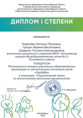 - в номинации «Педагогический проект по экологическому воспитанию дошкольников» награждены Дипломом I степени старший воспитатель Наталья Петровна Ковалева и воспитатели Марина Васильевна Грицан, Татьяна Александровна Шадрина (декабрь 2022 год);