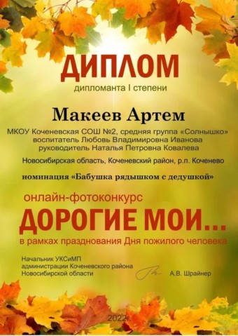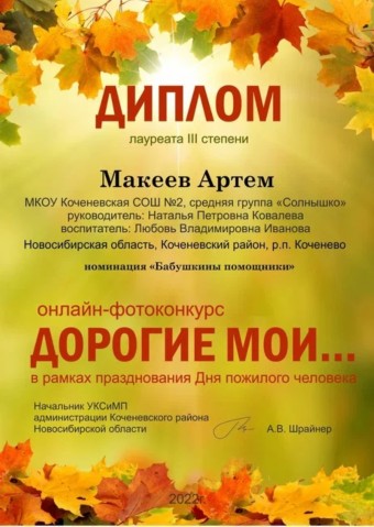 - Дипломами лауреатов I степени воспитанницы подготовительной группы Столярчук Полина и Гурьянова Маша под руководством воспитателя Ольги Николаевны Тарабановой (сентябрь 2022 год)