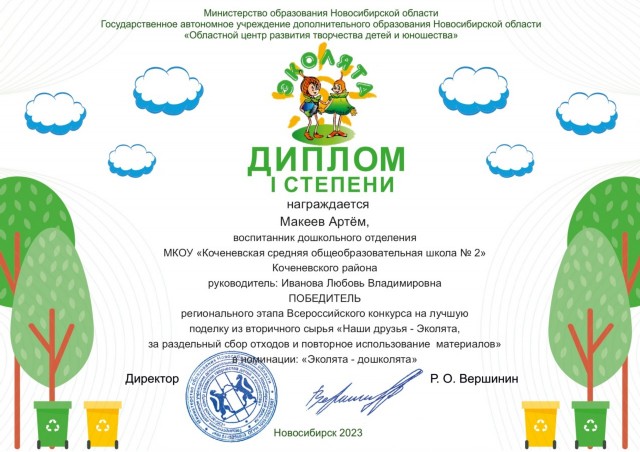 - награждены Дипломом I степени в номинации «Эколята –дошколята» воспитанник Макеев Артем и педагог Любовь Владимировна Иванова (май 2023 год)