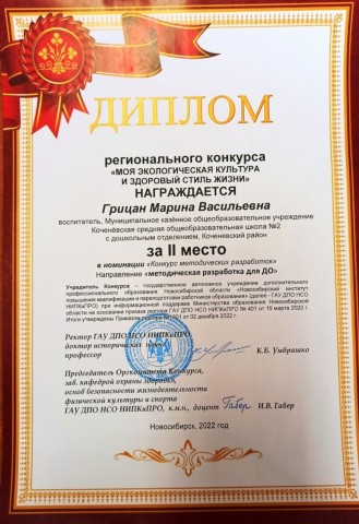 - Дипломом за II место в номинации «Конкурс методических разработок» в направлении «Методические разработки для ДО» воспитатель Марина Васильевна Грицан (декабрь 2021 год);