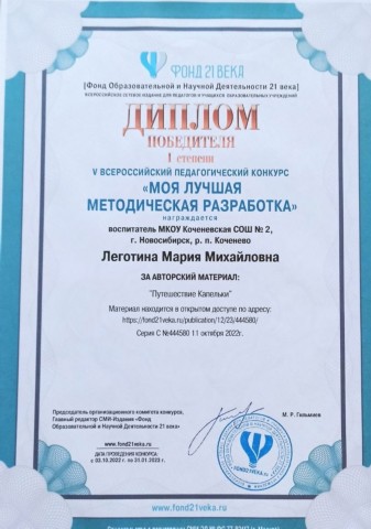 V Всероссийский педагогический конкурс «Моя лучшая педагогическая разработка», организованный Фондом Образовательной и Научной Деятельности 21 века (https://fond21veka.ru/contest/mlmr), награждены: