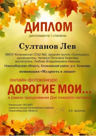 - Султанов Лев дипломант I степени, педагоги Любовь Владимировна Иванова, Наталья Петровна Ковалева (октябрь 2022 год)