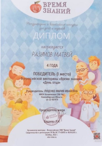 Всероссийская викторина "Время Знаний" (https://edu-time.ru), награждены: