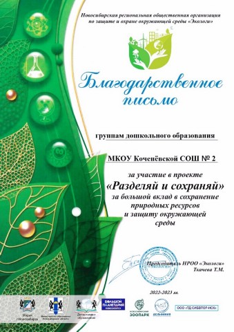 Региональный проект "Разделяй и сохраняй" по сохранению природных ресурсов и защите окружающей среды награждены группы дошкольного образования МКОУ Коченевской СОШ №2 (декабрь 2022 год);